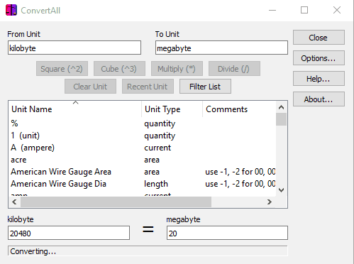 Convertall is a program to convert a quantity of one unit to a quantity of another unit. It supports over 500 unit types. You can quickly select a unit type by typing the first few letters of a unit and ConvertAll will attempt to autocomplete and filter the list of unit types to show only units types with matching words.