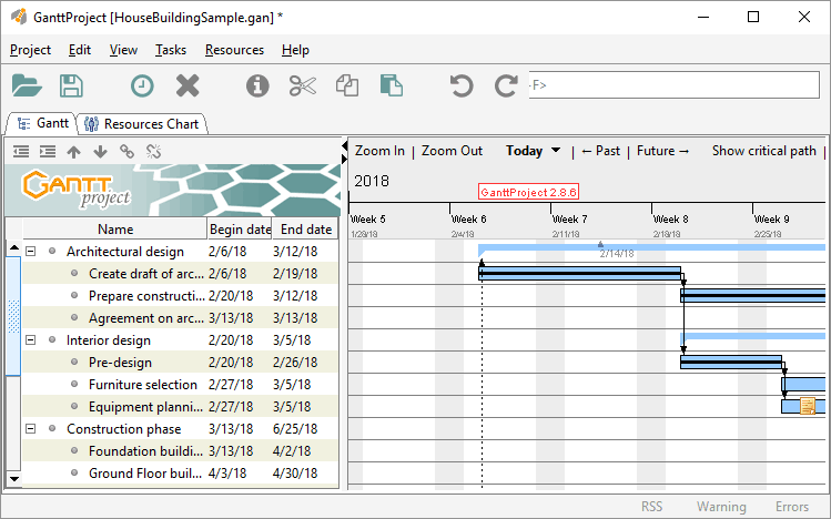 Ganttproject lets you create project schedules using Gantt charts and resource load charts. With GanttProject, you can break down your project into a tree of tasks and assign resources that have to work on each task. You can also create dependencies between tasks (this task must be completed before this task can start) and thus generate a schedule showing the expected timeline of the project.