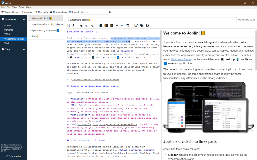 Notes can be synchronised with various cloud services (including Dropbox and OneDrive) and the application is available for Windows, MacOS, Linux and as a mobile app on Android and iOS.