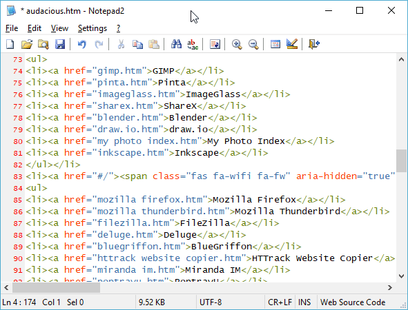 Notepad2 is a small, fast text editor with customizable syntax highlighting for HTML, CSS, PHP, Javascript, C/C++ and other common languages. It also offers search and replace using regular expressions. Notepad2's interface is very similiar to Windows Notepad.