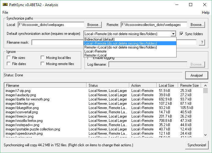 PathSync analyzes two directories and shows the user a list of differences between the directories. The user can select what actions should occur (which files to overwrite, which to delete, which to ignore), and allow PathSync to synchronize. These settings can be saved for future use.
