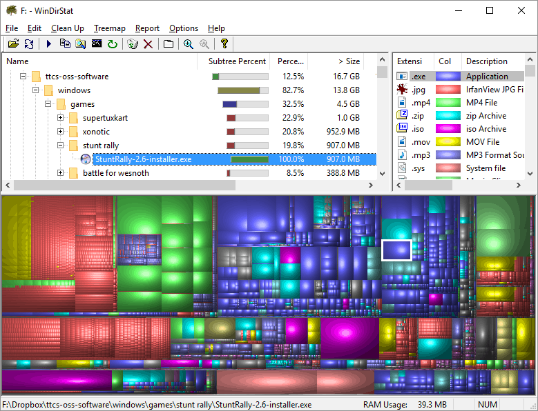 A treemap represents each file as a coloured rectangle, the colour indicating the type of file. The area of the rectangle is proportional to the file's size. So you can quickly see what which is the largest file and which types of files are occupying the specified drive or folder. Clicking on the rectangle will reveal more details as well as possible actions (copy the file, open in Windows Explorer, delete the file, etc)